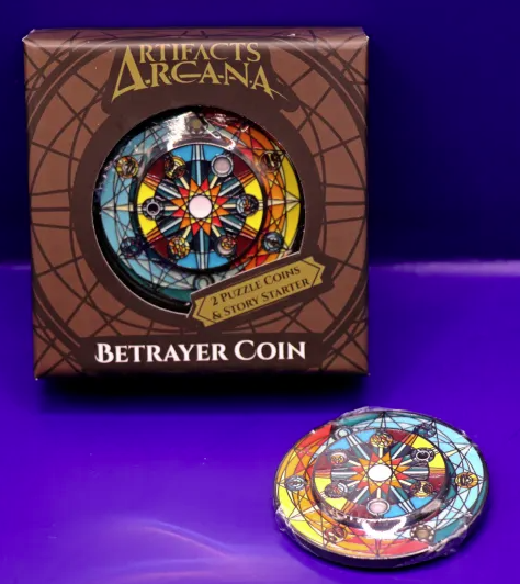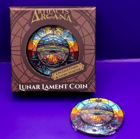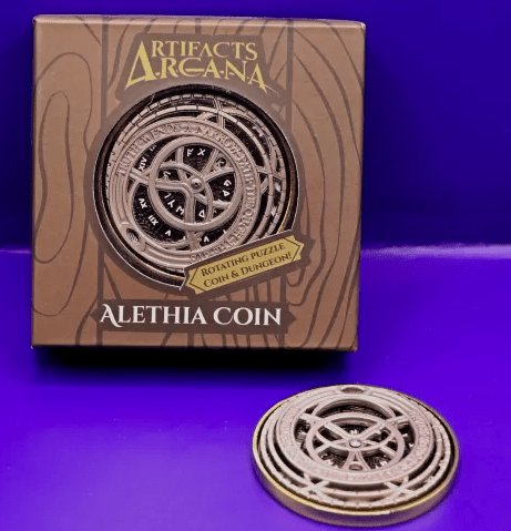 Alethia is a 5-10 hour system agnostic TTRPG module in contained in a coin with mechanical moving pieces. 8k words including design for dozens of puzzles, riddles, and encounter building. All content has been written by Michael.