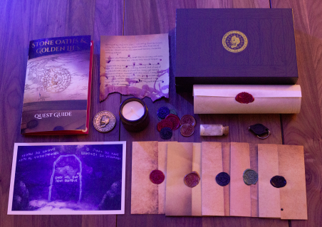Stone Oaths and Golden Lies is a 12-20 hour system agnostic TTRPG module in a box with physical props. Narrative design includes several wax sealed letters with UV elements, a map, glow in the dark props, a metal coin, and a scented candle. 22k words including puzzle design, riddles, and encounter building.